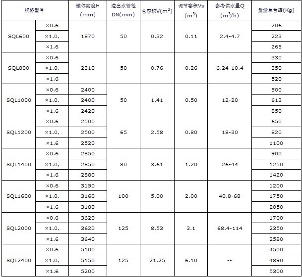 SQL系列立式隔膜式氣壓罐技術(shù)性能參數(shù)表