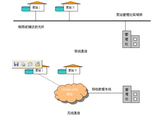 通信平臺常用兩種,一是有線通信:每個加壓泵站與水司之間租用光纖通信,調度中心、泵站監(jiān)控中心、各職能部門之間通過局域網(wǎng)通信,該通信平臺可傳輸連續(xù)圖像。二是無線通信:每個加壓泵站與調度中心之間通過GPRS無線網(wǎng)絡通信,調度中心、泵站監(jiān)控中心、各職能部門之間通過局域網(wǎng)通信,該通信平臺不能傳輸連續(xù)圖像。