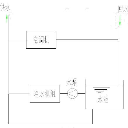 如圖1,為一水池蓄冷系統(tǒng)簡圖,在利用水池冷水供冷時,水泵要克服從水池吸入點到系統(tǒng)的水柱壓力,此外還要克服左側(cè)部分水路的管件、管路、冷水機組以及末端設備阻力。這樣泵的揚程為上述阻力與水柱壓力之和。