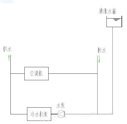 如圖2,為典型膨脹水箱定壓空調(diào)冷凍水系統(tǒng)簡圖,水在膨脹水箱處是與空氣接觸的,對系統(tǒng)腐蝕是不利的。但該系統(tǒng)是一個閉式系統(tǒng)。因為右側(cè)水柱壓力與左側(cè)水柱壓力互相抵消,水泵運行時不需要克服水柱的勢能,只要克服系統(tǒng)(左側(cè)部分與右側(cè)部分)水路的管件、管路、冷水機組以及末端設備阻力,所以樓高、樓正、樓歪影響不大。這樣泵的揚程為上述阻力之和。