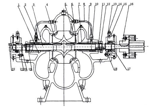 1 泵體 2 泵蓋 3 葉輪 4 軸 5 密封環(huán) 6 葉輪螺母 7 止動墊圈 8 軸套 9 填料壓蓋 10 填料環(huán) 11 填料 12 懸架軸承部件
