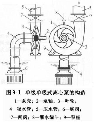 圖3-1是給水排水工程中常用的單級(jí)單吸式離心泵的基本構(gòu)造。水泵包括蝸殼形的泵殼1,和裝于泵軸2上旋轉(zhuǎn)的葉輪3。蝸殼形泵殼的吸水口于水泵的吸水管4相連接,出水口與水泵的壓水管5相連接。水泵的葉輪一般是有兩個(gè)圓形蓋板所組成,蓋板之間有若干片彎曲的葉片,葉片之間的槽道為過(guò)水的葉槽,如圖3-4所示。葉輪的前蓋板上有一個(gè)大圓孔,這就是葉輪的進(jìn)水口,它裝在泵殼的吸水口內(nèi),與水泵吸水管路相連通。離心泵在啟動(dòng)之前,應(yīng)先用水灌滿(mǎn)泵殼和吸水管道,然后,驅(qū)動(dòng)電機(jī),式葉輪和水作高速旋轉(zhuǎn)運(yùn)動(dòng),此時(shí),水受到離心力作用被甩出葉輪,經(jīng)蝸形泵殼中的流道而流入水泵的壓水管道而輸入管網(wǎng)中去。在這同時(shí),水泵葉輪中心處由于shuibeishuaichu而形成真空,吸水池中的水便在大氣壓力作用下,沿吸水管而源源不斷地流入葉輪吸水口,又受到高速轉(zhuǎn)動(dòng)葉輪的作用,被甩出葉輪而輸入壓水管道,這樣就形成了離心泵連續(xù)輸水。