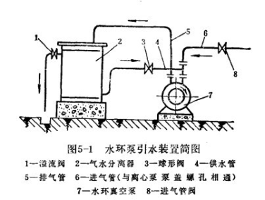 水環(huán)式真空泵引水裝置如圖5-1所示。水環(huán)式真空泵的進(jìn)氣管6與水泵泵蓋的頂部相連,在沒(méi)有自來(lái)水的地方,必須配置氣水分離器,作為真空泵冷卻水和補(bǔ)充水的水源。
