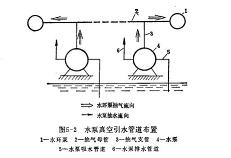 如果泵站中有兩臺(tái)以上的水泵,則可將水環(huán)式真空泵進(jìn)氣管與抽氣母管相通,每臺(tái)泵的泵殼頂部通過(guò)抽氣支管與抽氣母管相連。在每個(gè)支管上都安裝一個(gè)閥門(mén),以便可以單獨(dú)對(duì)每一臺(tái)泵抽氣。有時(shí),為了備用起見(jiàn),可以設(shè)置兩臺(tái)水環(huán)式真空泵,每一臺(tái)的進(jìn)氣管上都安上閥門(mén)。當(dāng)一臺(tái)發(fā)生故障時(shí),可以關(guān)閉該泵上的進(jìn)氣閥門(mén),利用另外一臺(tái)抽氣,不致耽誤水泵的起動(dòng)。正常情況下兩臺(tái)水環(huán)式真空泵可對(duì)水泵同時(shí)抽氣,以加快引水速度。整個(gè)管路布置如圖5-2所示。