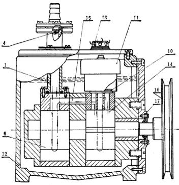 1.2X-1型旋片式真空泵:圖1是2X-1型雙級(jí)旋片式真空泵的剖面圖。氣體被抽除的路徑由圖中箭頭所示。排氣活門(閥片10)是用耐油橡膠板做成。為防止固體微粒落入泵內(nèi)損傷表面,特在進(jìn)氣管里裝有進(jìn)氣濾網(wǎng)(4)。在排氣閥上裝了油氣分離室(11),用它把被抽氣體所帶的油滴與氣體分離開,油流回箱里,氣體與部分油霧混合物排到大氣中去。整個(gè)泵體浸在油箱(12)中,淹沒泵的排氣閥,從而保證整個(gè)泵體密封。軸封(17)用的是耐油橡膠密封墊圈,用壓板在軸外固定。